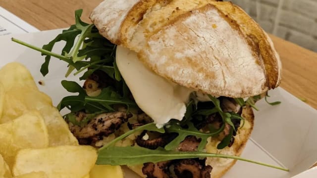 - Patate schiacciate, rucola, burratina, mayo al mojito.