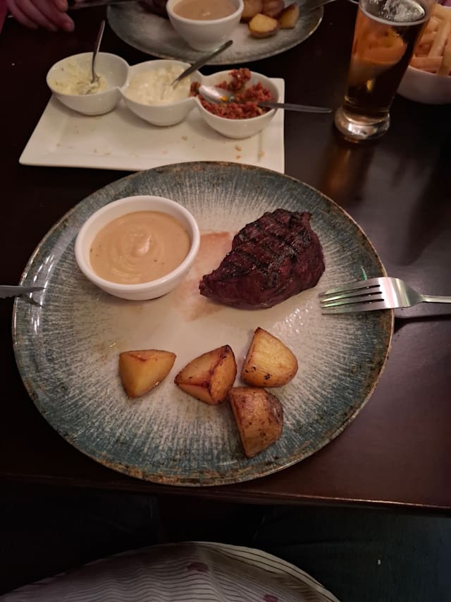7/10We choose this restaurant, because of the good reviews, essentially. Was pretty close to our house, as a parents we prioritize distance, so we evoid crying baby on the car. We were kindly welcome to the restaurant. Bonus for staff. Have quite a lot of choices. For everyone, to create a different experience. We had some starters, like the bread with 3 varieties of sauces, really appealing and tasty. My husband had the mix of grilled meat, I had Gorgonzola on the meat, my daughter chicken curry, and fish sticks. Perhaps was because of the high temperature outside and inside, the meat was good but not so tasty. We really like the starters, and the desert. Best desert in the world by Sinjoor: try it!