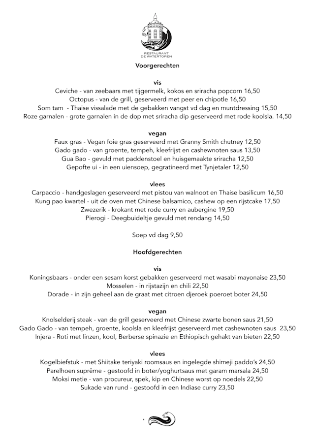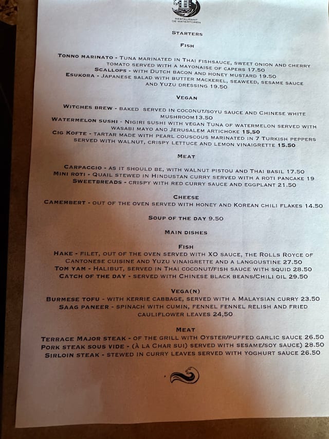 10/10We love the menu with limited choices per fish, meat and vegan which guarantees freshness and from trusted supplier. Prepared in different cuisine styles and all excellent. The hosts are informal and know how to make you feel at home. (The location is in historical DWL area, very well reachable by car and public transport. I personally feel the Watertoren is best suited for parties up to 4.)