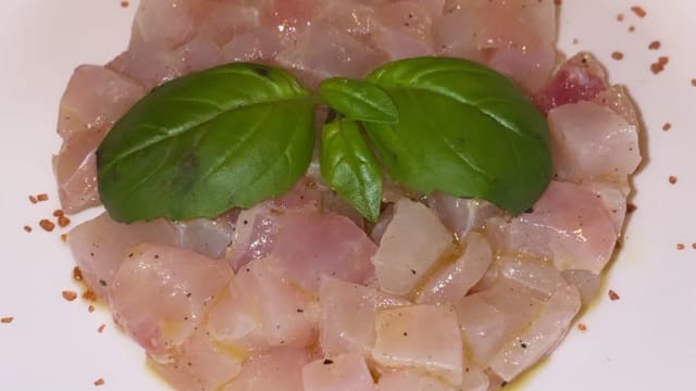 Tartare di gambero con pere e mandorle , tartare di scampo su letto di caprino al limone , tartare di salmone su letto di yogurt