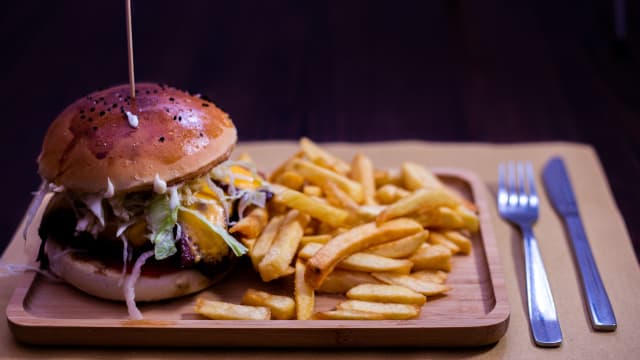 Hamburger di chianina da 220 gr con cheddar, maionese, barbecue, pomodoro, bacon croccante, cipolla caramellata e insalata, con contorno di patate fritte