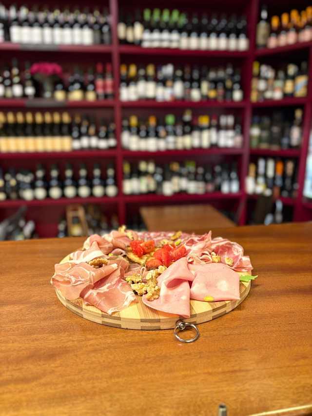 - Degustazione di salumi. Selezione di salumi accompagnati da crostini (prosciutto crudo, capocollo, mortadella, salsiccia secca nostrana, pancetta arrotolata, salsiccia piccante, lonzino)