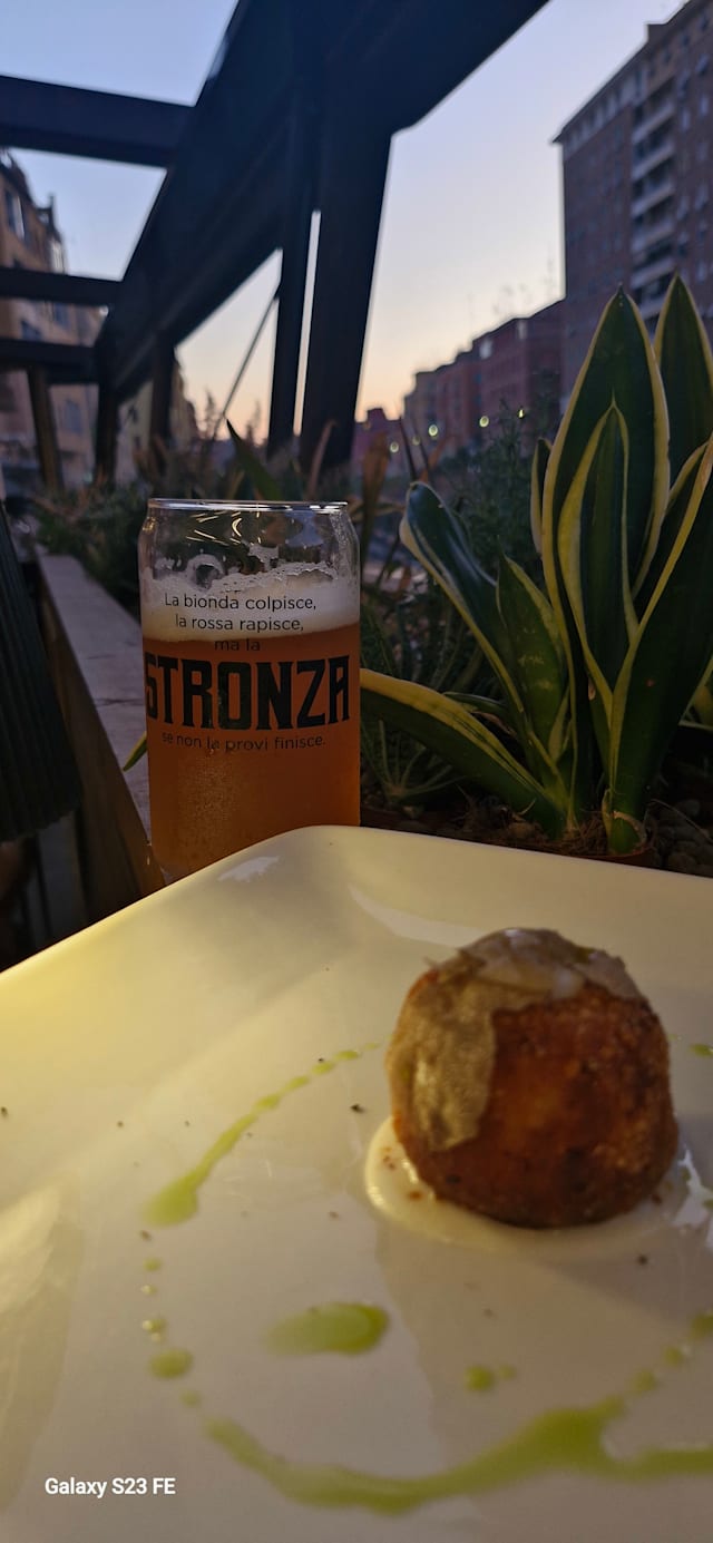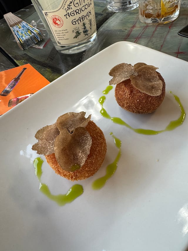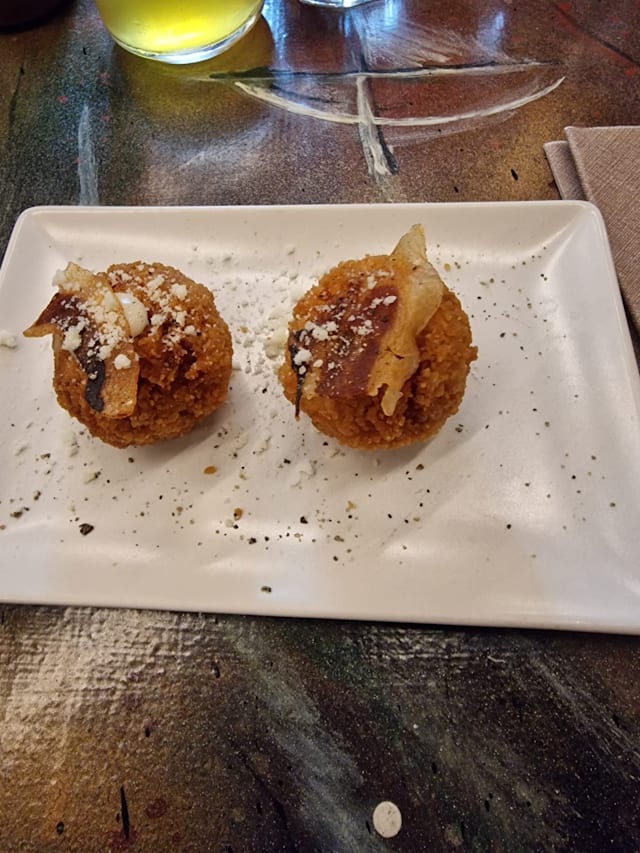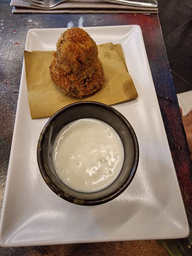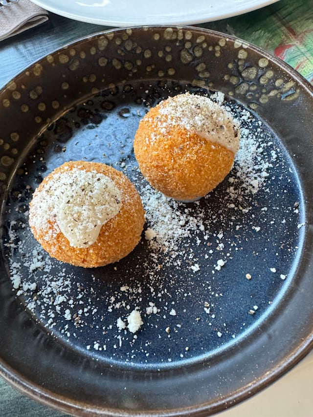 Crochetta di patate mantecata con parmigiano reggiano, picchiapó, fonduta di pecorino romano e pepe nero.