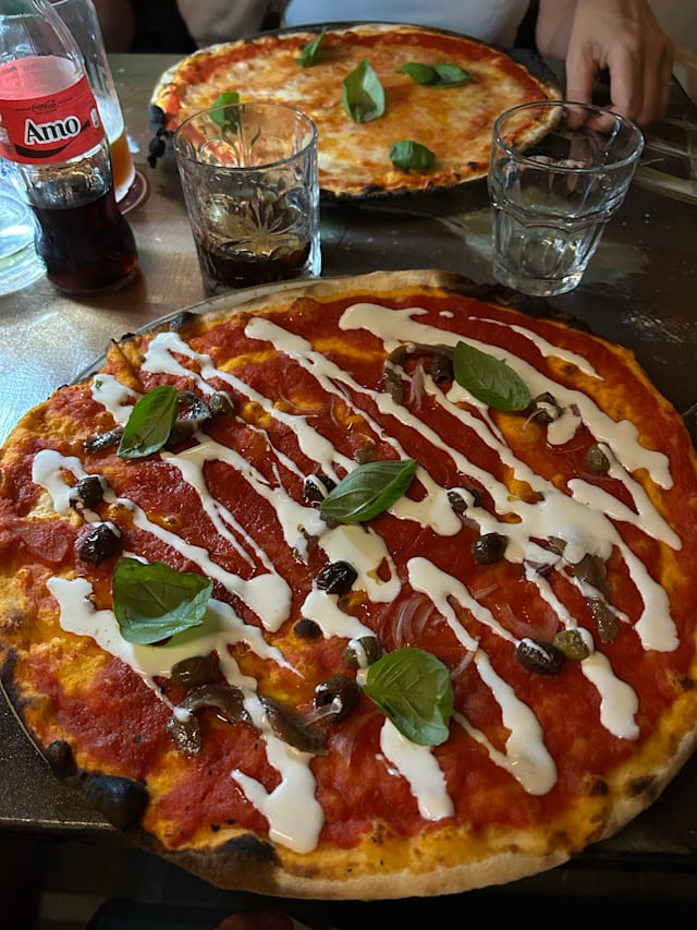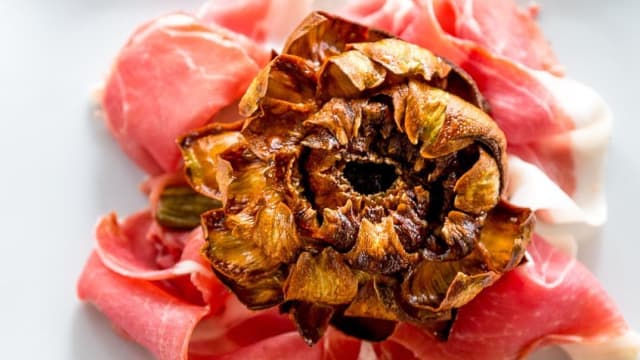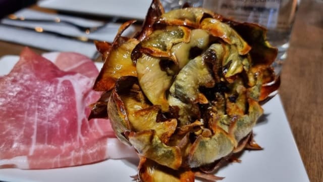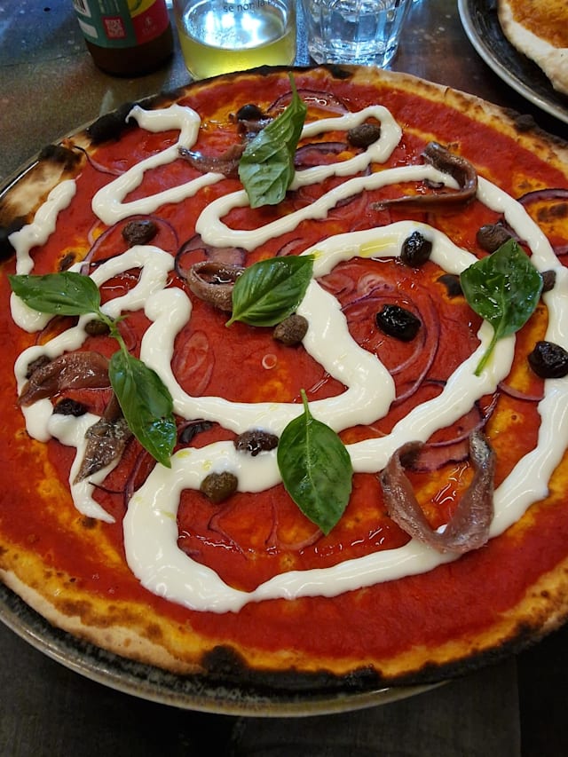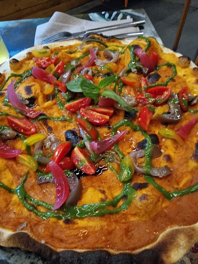 Pomodoro, fior di latte, funghi in base alla stagionalitá, carciofo di sezze a gambo lungo, terra di taggiasche del frantoio di sant’agata, uovo poché bio, prosciutto di parma ghirardi 30 mesi.
