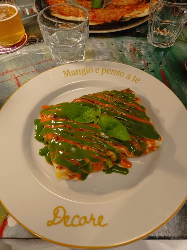 Pasta fatta in casa farcita con parmigiana di melanzane, top di coulis di datterini, salsa al basilico e fonduta di parmigiano reggiano.