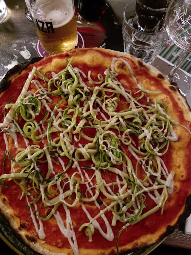 - Pomodoro, fior di latte, funghi in base alla stagionalitá, carciofo di sezze a gambo lungo, terra di taggiasche del frantoio di sant’agata, uovo poché bio, prosciutto di parma ghirardi 30 mesi.