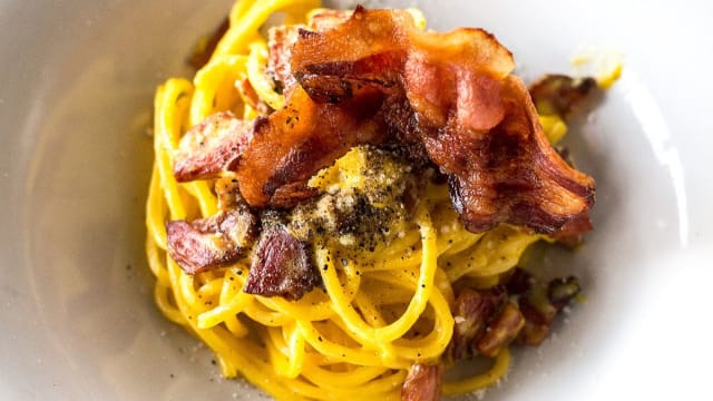 Riso carnaroli, sugo all’amatriciana, fonduta di pecorino romano, pepe, guancialecrispy.