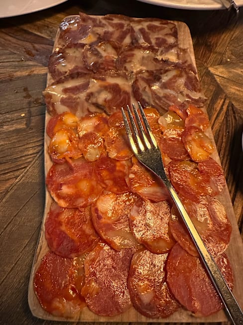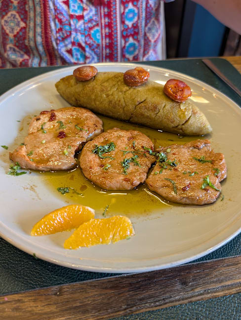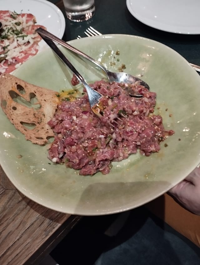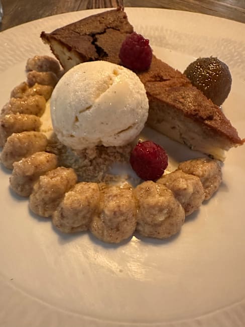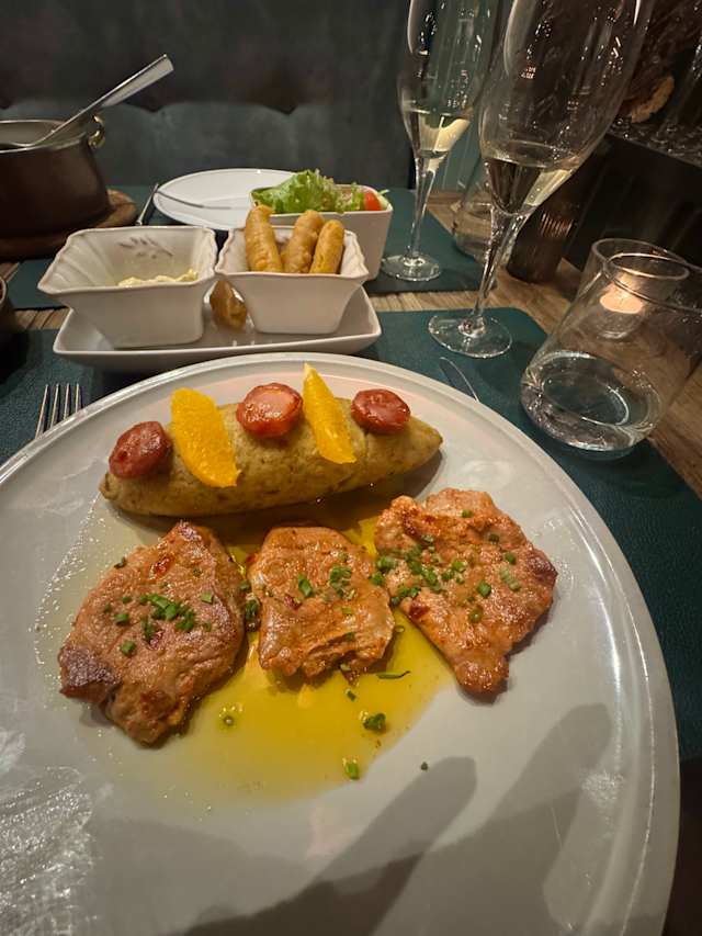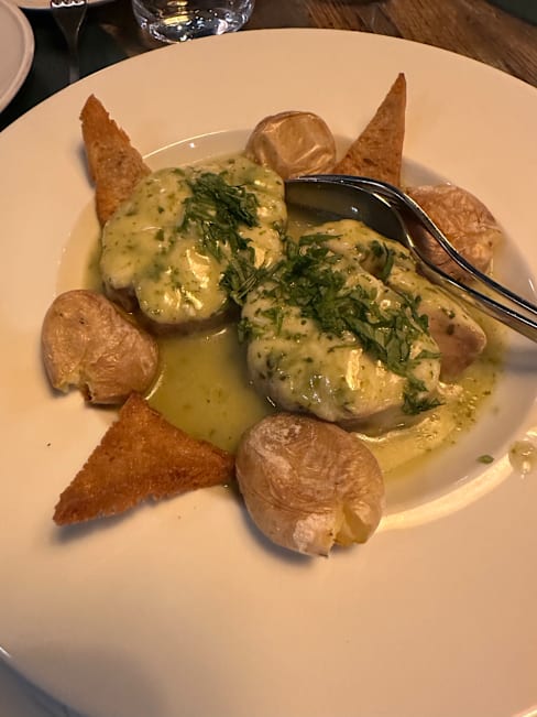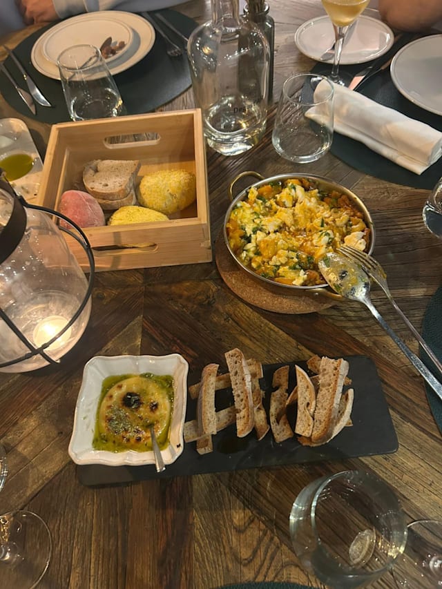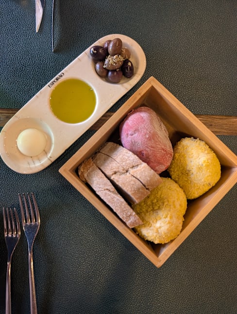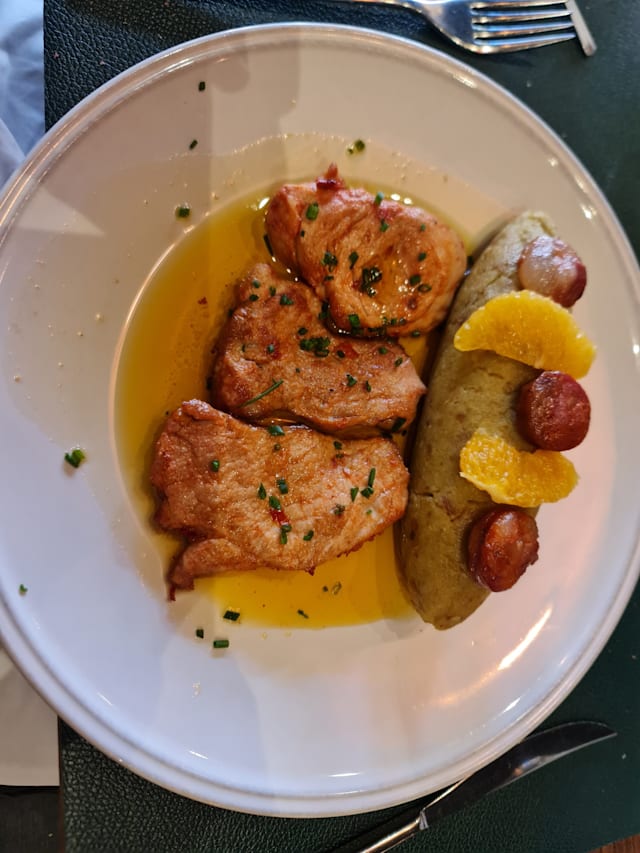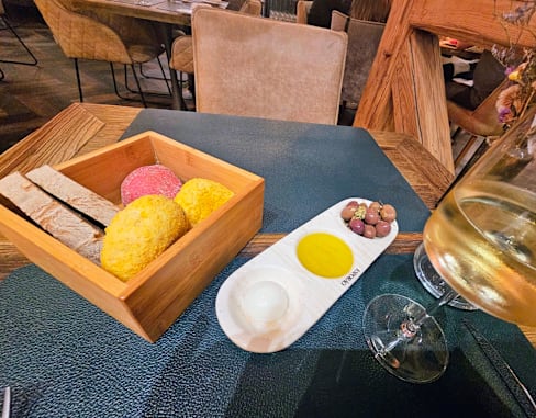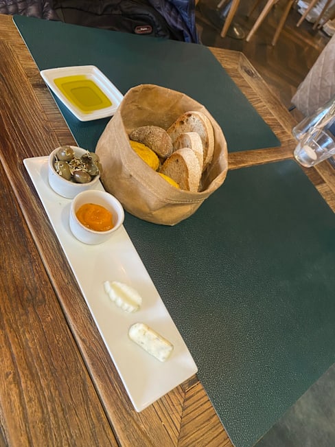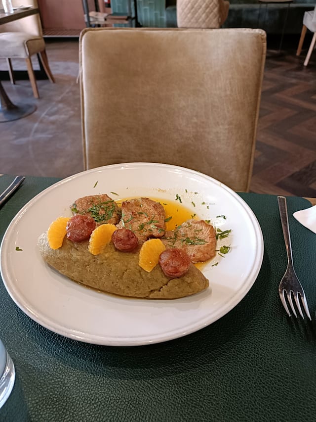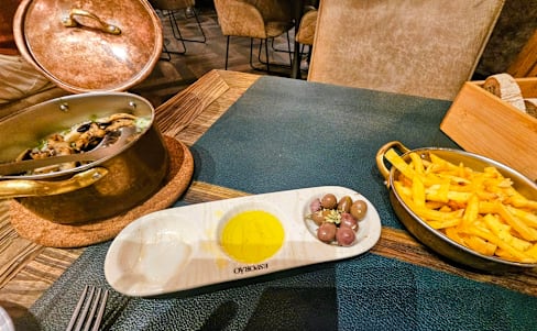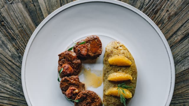 8/10+4Really tasty food, especially the couvert with aromatic olive oil, artisanal butter and olives along with different types of bread, all of them delicious. We tried the pork loin and the pork cheeks and it was very well done. The decor of the place is also pleasing, and blends elegance with rustic in a low light environment that makes you feel good from the moment you sit at the table until you leave.