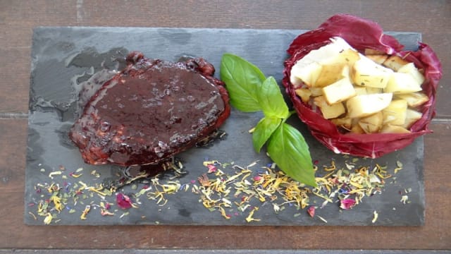 (Crema di zucca, bufala, fiori di zucca, guanciale, scaglie di mandorle)