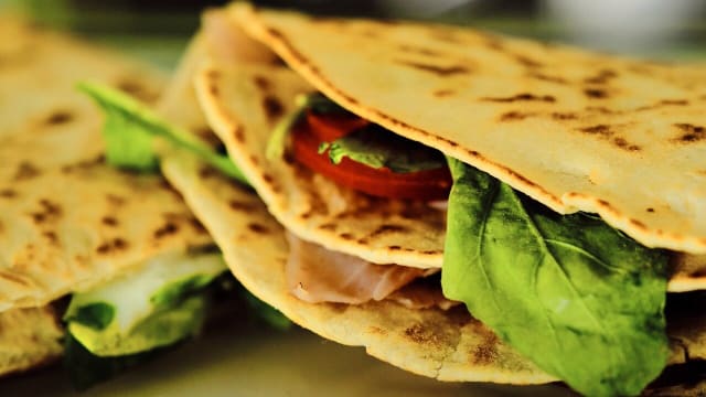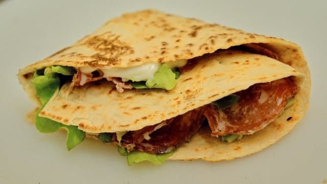 Prosciutto cotto, pecorino fresco di san gimignano e lattuga. Con crumble di piadina