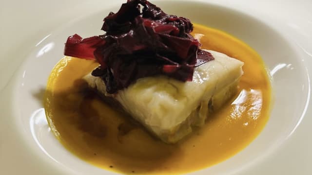 merluzzo, parmentier di zucca, radicchio e aceto balsamico