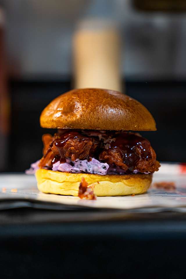 - Contramuslo de pollo en tempura, frito y crujiente, con salsa BBQ casera, coleslaw y bacon crujiente, en un pan brioche.