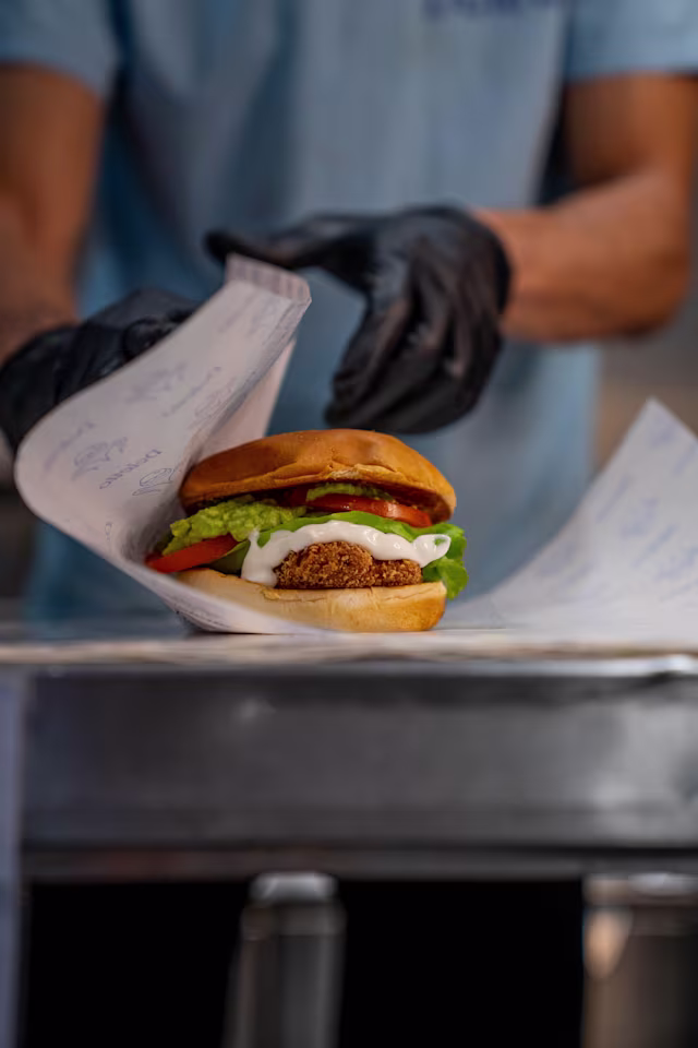 - Burger vegana de Heura, con queso 100% plant-based, pepinillo y nuestra salsa especial, en un pan brioche vegano.