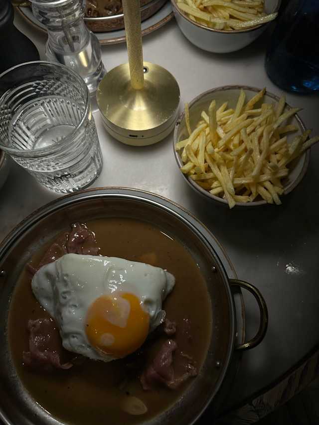 - Presunto, louro, alho, ovo estrelado, batatas fritas