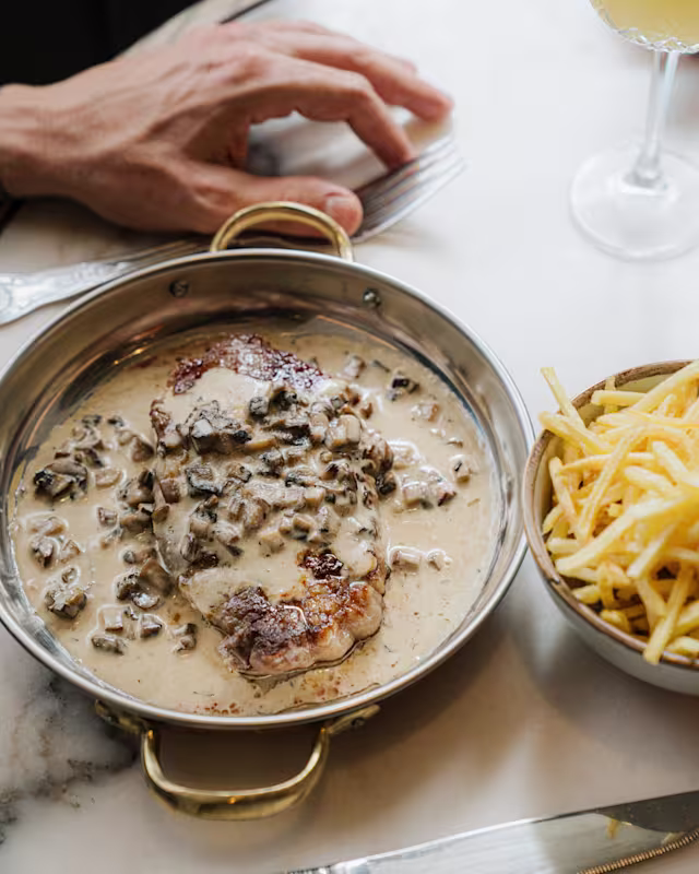 - Na chapa, molho de cogumelos, batatas fritas, salada verde