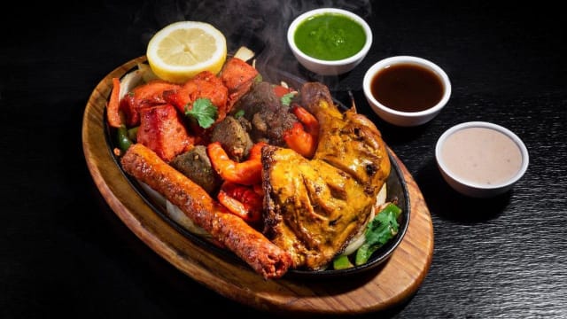 Combination of tandoori grills (chicken, lamb chop, seekh kebab, lamb and chicken tikka) , served with rice & mix veg