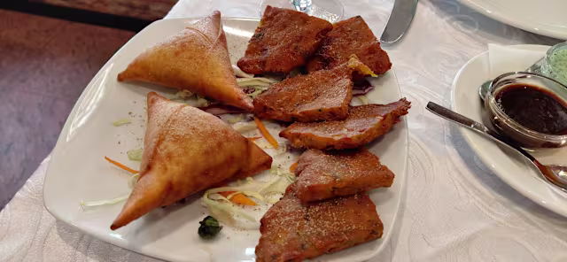 - Variedade de chamuça, vegetable pakora, paneer pakora, onion bhaji e chicken pakora