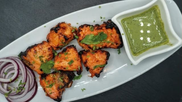 Tandoori di pollo con cipolla, salsa di peperoni e coriandolo