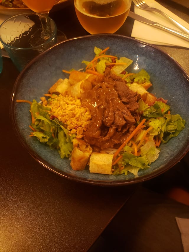 8/10I enjoyed their take on the class tofu pad thai. I watched it being cooked and the ingredients tasted fresh and good quality. The portion size was correct, while not overly generous. My family sat on the terrace, which had well separated tables and a mix of real and artificial plants and little sculptures and other decorations. It had a nice ambience in the evening, limited only by the proximity to a noisy main road, which is at least partially hidden by the garden wall. Every table has a bottle of mosquito repellant, but I was bitten once on my leg while spraying my arms and later again on my arm, despite the spray. The mosquitos are that quick and determined! Long trousers and a long sleeved shirt are recommended if you are like me, a mosquito magnet. The service was friendly but a little neglectful, but overall it was a nice experience and I would go back.
