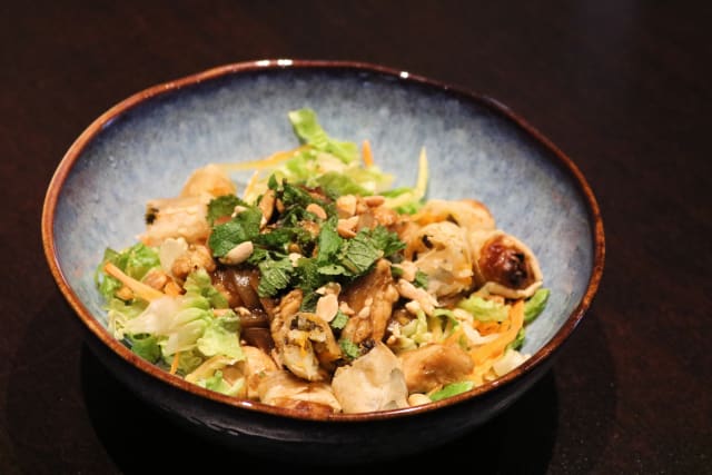 Wok émincés filet de poulet frais origine france, vermicelles de riz, crudités, nems végétaux, cacahuètes, menthe et sauce du chef.