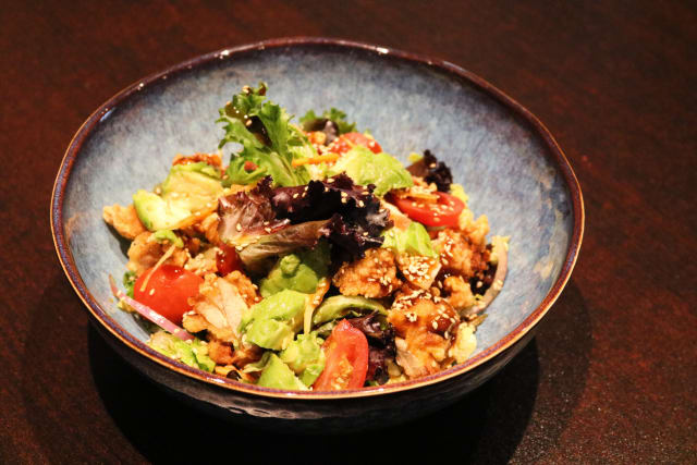 Poulet croustillant à la japonaise à la teriyaki et sésame, œuf mollet, cébette et crudités sur son lit riz sautée aux légumes.