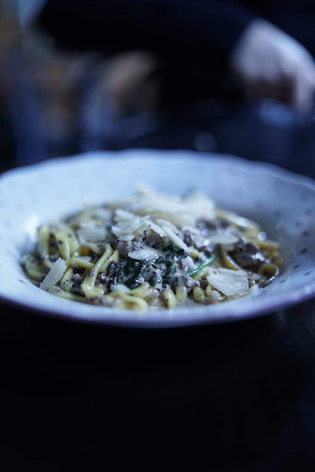 Bandpasta med strimlad kalvsinnanlår, tryffelkräm, parmigiano reggiano, bladspenat och mascarpone.