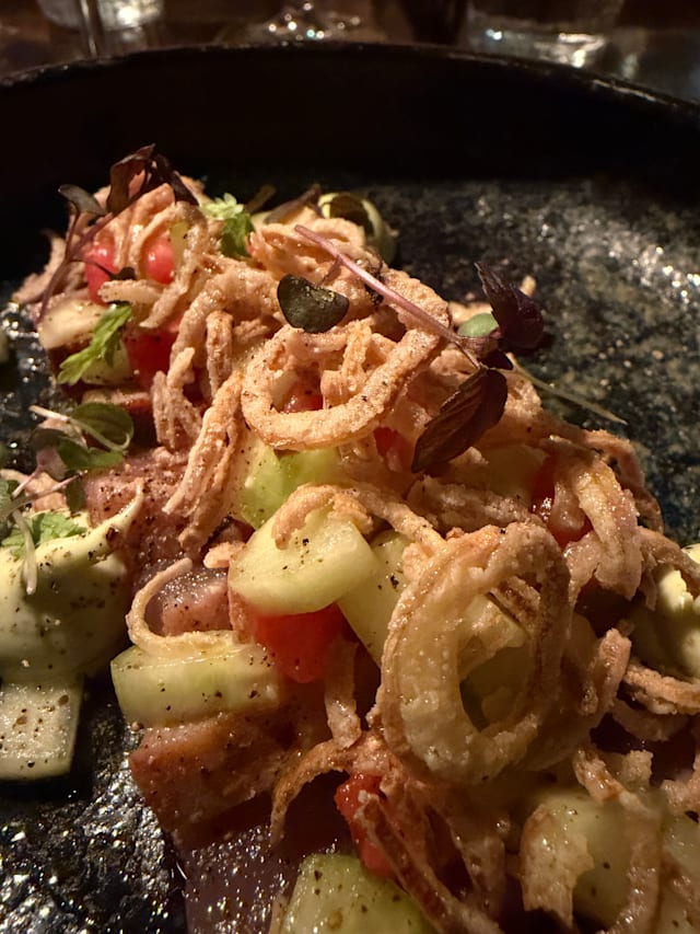 Sotad tonfisk, krassemajonnäs, picklad gurka och melon samt friterad scharlottenlök .