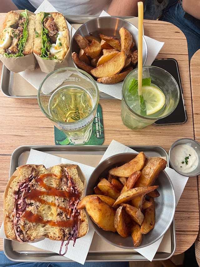 7/10went there for pulled meat sandwich but they didn't have it. asked for no ketchup in one of our orders and that wasn't respected. we also asked for bottle of wine and jug of water. Water never came and we only received a glass of wine. So we quickly finished the food and left. the place is too busy to have only 2 people working.
