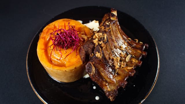 Costillar de cerdo asado a baja temperatura con sinfonía de calabazas asadas y un toque de crema de Gorgonzola