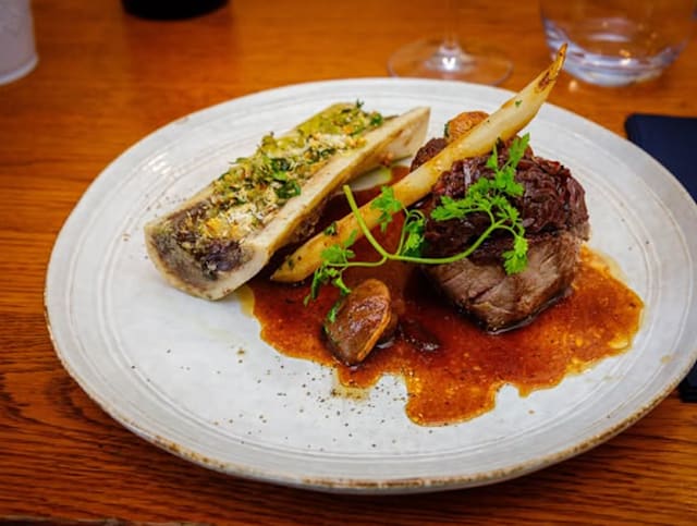 - Cœur de rumsteak poêlé aux échalotes confites, sauce vin rouge, os à moëlle gratiné, pommes frites