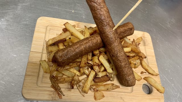 Saucisse, fromage à raclette, chapelure cornflakes et chinoise, sauce spéciale