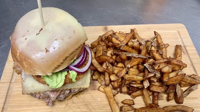 Buns, steak 150g VBF, galette de pomme de terre, manchego, jambon serrano, tomate,