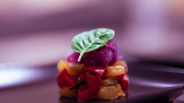 - 2 tacos ripieni di ragù di polpo , chiodi di patate viola , guanciale iberico e porro croccante
