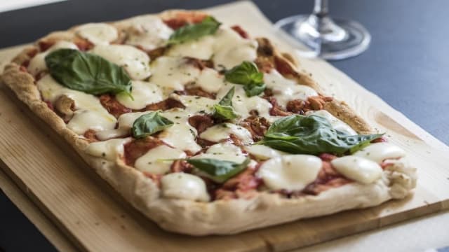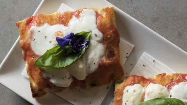 Mozzarella fior di latte, albahaca fresca, tomate san marzano, , balsámico & AOVE.
