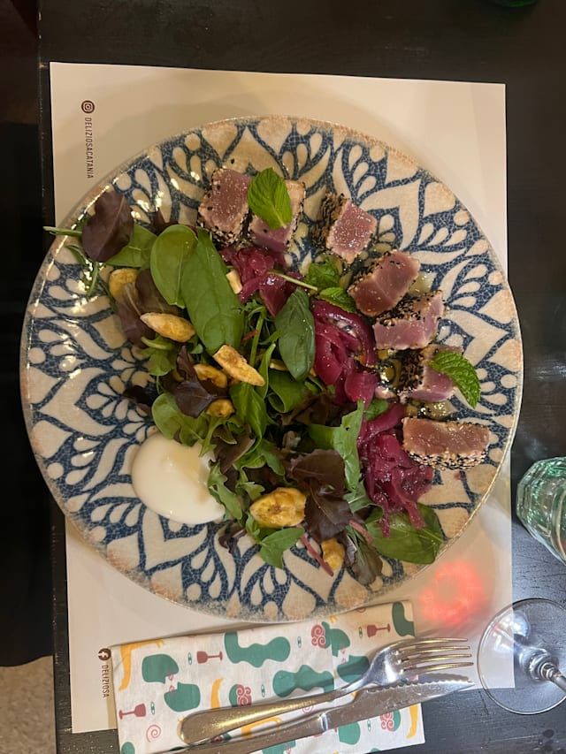 10/10This is a fantastic restaurant in the heart of Catania, across the square from the Cathedral. It serves hearty Sicilian dishes using fresh, local ingredients. We had a great tomato salad, potatoes in cheese sauce, salmon and swordfish followed by pistachio tiramisu which was a delight. Friendly and attentive staff, beautiful decoration and lights, warm atmosphere and great food. What's not to like?