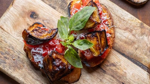 Melanzane grigliate, provola ragusana affumicata, uovo siciliano bio sodo, pesto di basilico casareccio, salsa di pomodoro siciliano, fonduta di grana padano DOP, scaglie di grana padano DOP