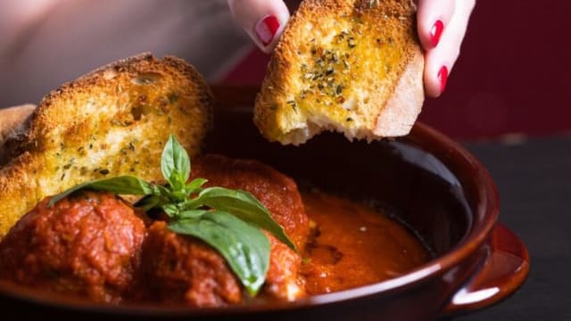 Polpette di carne dal cuore filante al sugo servite con crostini di pane caldo