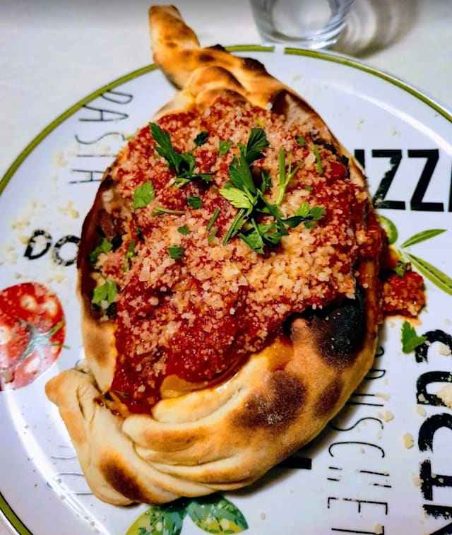 Dubbelgevouwen pizza met ham, salami, ui, kaas, champignons, bolognesesaus en oregano