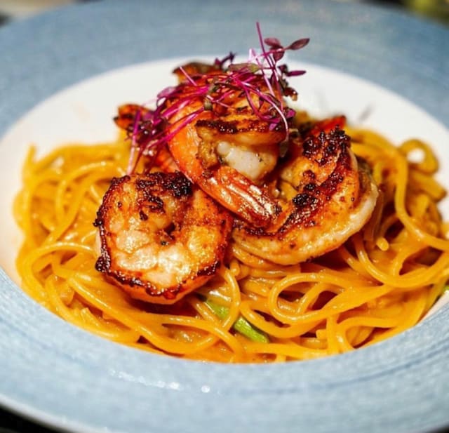 Ongepelde grote garnalen van de grill in knoflookolie met specerijen. Keuze uit: spaghetti aglio olio en gebakken aardappels en broccoli