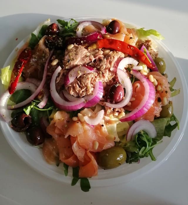 Ijsbergsla, tonijn, uien, komkommer, tomaat, olijven, kappertjes, olijfolie en kruiden