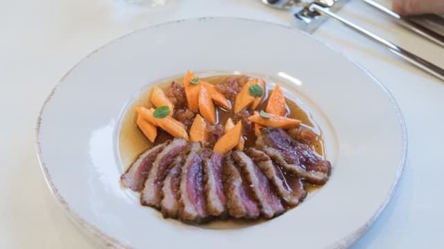 - Petto d'oca, carote glassate alla kombucha e pesche marinate