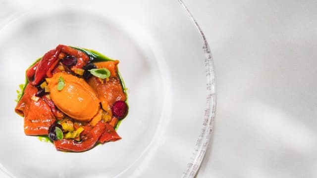 - Falde di peperoni arrostiti, il loro sorbetto, pesca marinata e olio al basilico