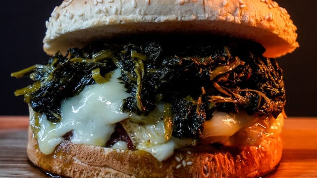 Burger 180 g, crema di bra dop, peperoni,cipolle rosse caramellate, insalata, pomodoro,salse