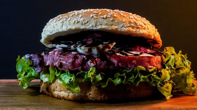 Burger 180 g,crema di parmigiano dop, bacon, insalata, pomodoro,salse