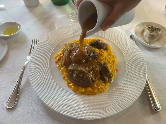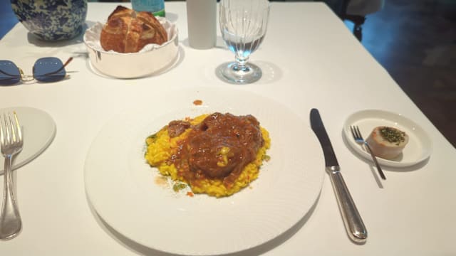 9.5/10I had the egg yolk with potato and truffel which was a brilliant combination and thoroughly enjoyable as well as moorish. My partner had the beef carpacccio which was beautiful with the simple flavours of the ingredients left to shine. As the main dish, I chose the pheasant pasta. That was the highlight of my evening. Extremely tasty sauce with star annis as the surprise ingredient and a silky smooth pasta. The beef dish my partner had was well prepared and looked amazing. We had a lovely evening and would definitely recommend this place to anyone passing through Monza or staying at the Hotel de la Ville. In short, all the food was prepared with care and presented beautifully.