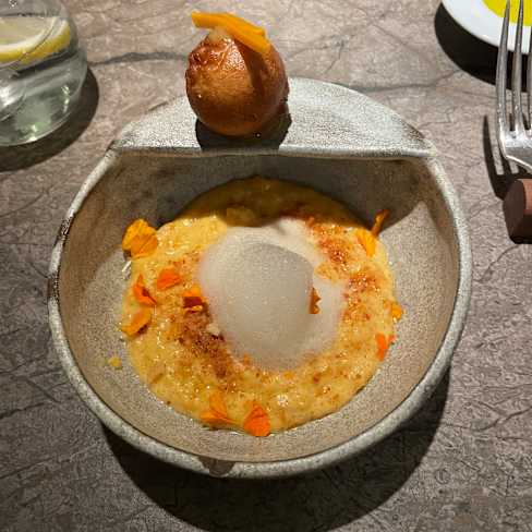 10/10I really enjoyed the pork rolls and the deer steak. Be careful when ordering the squid ink bread—it will turn your mouth completely black! But it’s a lot of fun if you’re with friends. The chicken with foie gras was disappointing. It was very dry, and the foie gras flavor was barely noticeable. This is also the first Michelin-selected restaurant where we didn’t like the desserts. The cheesecake wasn’t sweet, and the dessert called "Grandma’s Breakfast" had plain kefir and dill in it. It was a strange and unpleasant combination.