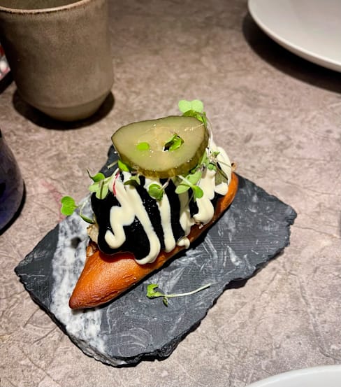 10/10I really enjoyed the pork rolls and the deer steak. Be careful when ordering the squid ink bread—it will turn your mouth completely black! But it’s a lot of fun if you’re with friends. The chicken with foie gras was disappointing. It was very dry, and the foie gras flavor was barely noticeable. This is also the first Michelin-selected restaurant where we didn’t like the desserts. The cheesecake wasn’t sweet, and the dessert called "Grandma’s Breakfast" had plain kefir and dill in it. It was a strange and unpleasant combination.