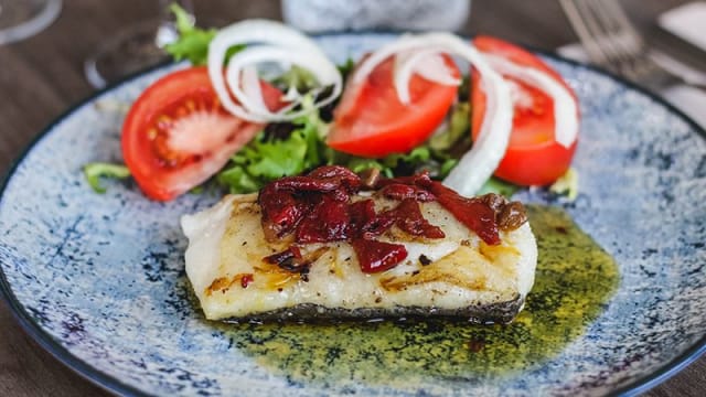 Lomo de bacalao gratinado con mahonesa de ali oli, tomate confitado y piñones