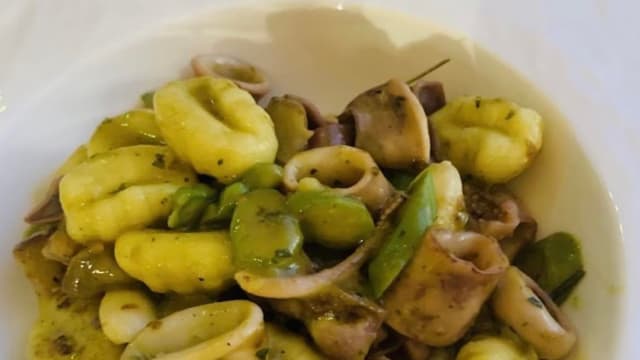 Gnocchi di patate con gamberi viola di sanremo, zucchine trombette e nocciola