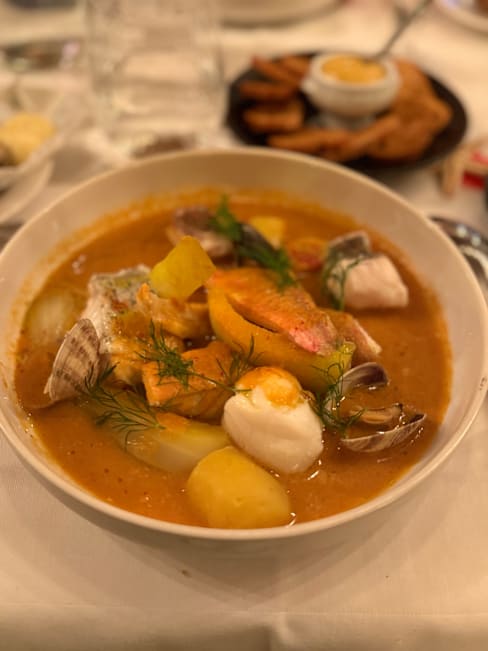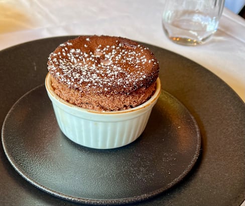 7/10Oysters were fresh and briny. The soup de poisson was not memorable along with the Bouillbaisse which had a hearty selection of fish including the required rascass but not enticing without the added rouille. Chocolate souffle was rich and satisfying. Ambience was tranquil and pleasant. We sat in a comfortable banquette side by side.
